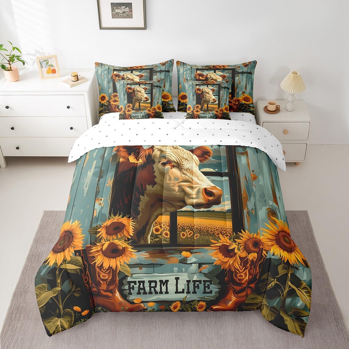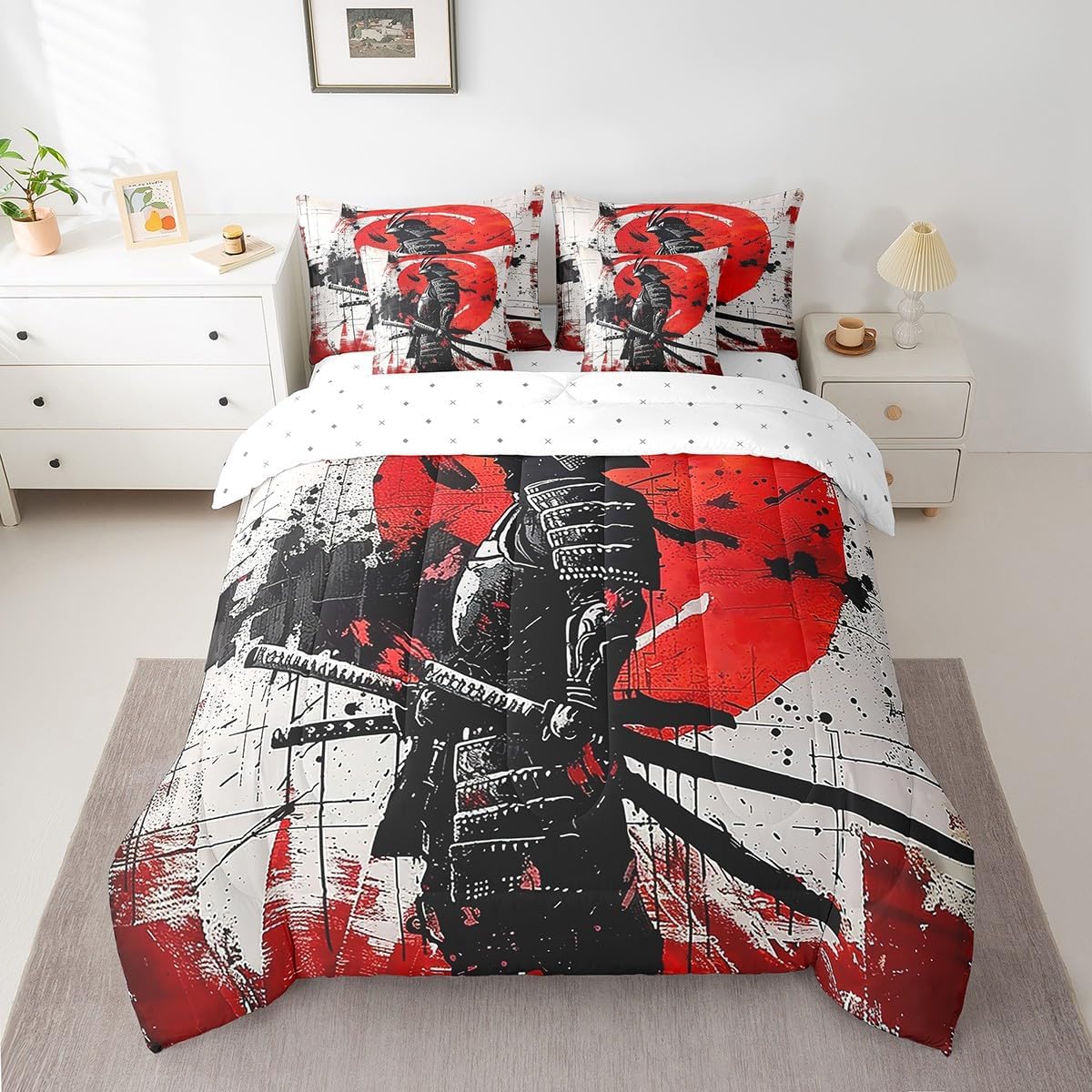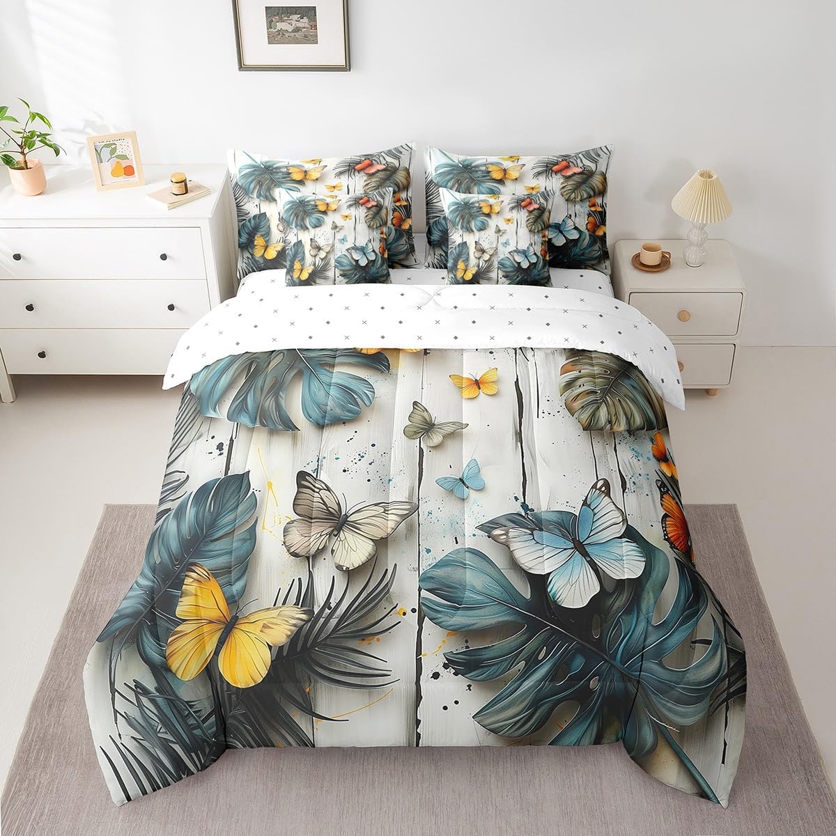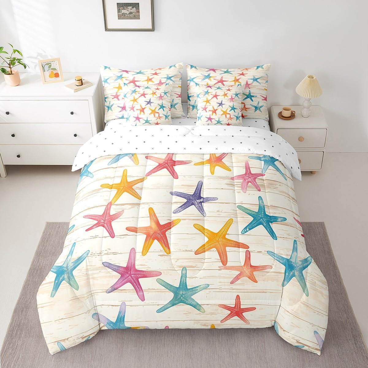 Welcome to our store: We have specialized in home textile for many years.We are contribute to provide the best customer service and products.If you have any questions,please contact us anytime.We'll try our best to answer your questions and solve your problems; Size information: Twin size: 1 Down Comforter ,68"W x 90"L, 1 Fitted Sheet ,39"W x 75"L x 16"H, 1 Flat Sheet ,67"W x 96"L, 2 Pillowcases ,20" x 30", 2 Throw Pillow Covers ,18" x 18"; Full size: 1 Down Comforter ,79"W x 90"L, 1 Fitted Sheet ,55"W x 75"L x 16"H, 1 Flat Sheet ,81"W x 96"L, 2 Pillowcases ,20" x 30", 2 Throw Pillow Covers ,18" x 18"; Queen size: 1 Comforter ,90"W x 90"L, 1 Fitted Sheet ,60"W x 80"L x 16"H, 1 Flat Sheet ,90"W x 102"L, 2 Pillowcases ,20" x 30", 2 Throw Pillow Covers ,18" x 18"; King size: 1 Comforter ,104"W x 90"L, 1 Fitted Sheet ,78"W x 80"L x 16"H, 1 Flat Sheet ,90"W x 106"L, 2 Pillowcases ,20" x 36", 2 Throw Pillow Covers ,18" x 18"; Deep Pocket: Our 100% microfiber fitted sheet sets ,the deep pocket allows you to cover your mattress easily when needed. Simple and Convenient; Useful and practical: A luxurious product for homes,dorm rooms,hotels,guest rooms.Practical to use for being polyester, feels like cotton which is super soft and breathable.No chemicals used, no dye substance harming the health of you or your family; Unique design: Vivid Colors won't fade thanks to new 3D digital printing methods. These unique designs match well with various color palettes of your rugs, curtains, headboard, furniture, and all other decor accessories; Note: Our comforter, fitted sheet, sheet, pillowcases and pillow cases are all double-sided prints, as shown in the picture, not white. Washing instructions: Machine wash separately in cold water,hang dry, do not bleach;